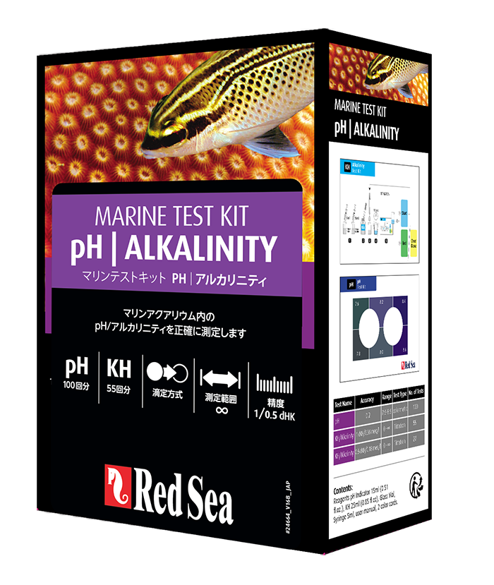 レッドシーのpH/アルカリニティ マリンテストキットにはアルカリニティを正確(1dKH/0.36meq/l)に測定できる滴定方式の試薬と全ての海水水槽に重要なパラメーターであるpHを測定する比色方式の試薬のセットです。